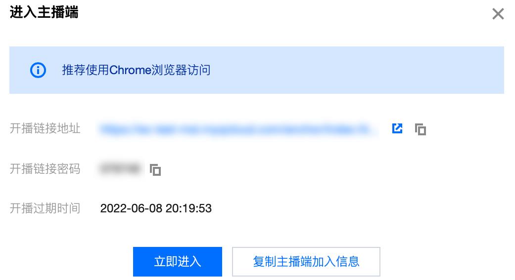2. 选择直播间,单击其操作栏的 进入主播端,可查看当前主播端的开播链接,以及开播链接密码。