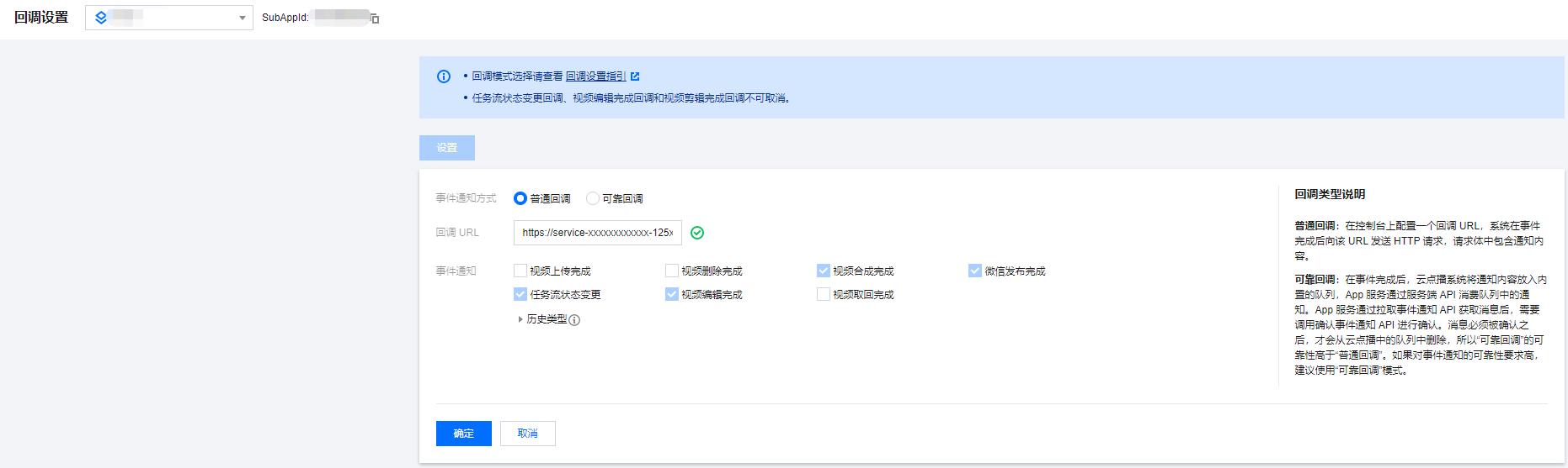 注意:如 避免影响生产环境 一节所述,操作之前请先确认您的线上业务不依赖于 VOD 事件通知。1. 登录 云点播控制台,单击左侧导航栏应用管理,进入应用列表页。2. 找到需要处理音视频文件的应用,单击应用名称进入应用管理页。3. 在左侧导航栏单击回调设置后,再单击设置,回调模式选择“普通回调”,回调 URL 填写 步骤4 中获得的事件通知接收服务地址,回调事件全部勾选,然后单击确定。如下图所示: