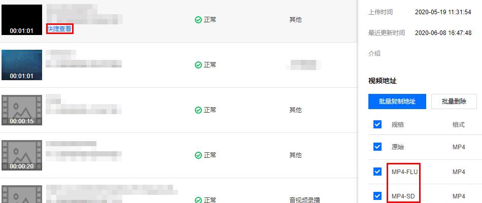2. 等待视频处理完成(状态变为“正常”)后,单击快捷查看,在页面右侧可以看到该视频有两个转码视频。如下图所示: