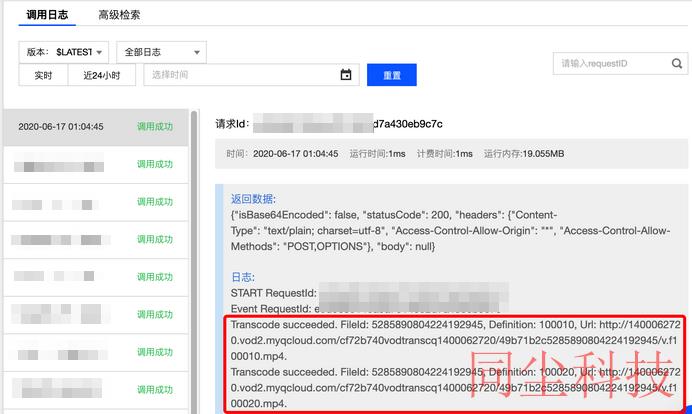 3. 登录 SCF 控制台 > 函数服务,单击对应函数名进入“函数管理”页,左侧导航栏选择日志查询来查看 SCF 日志记录,在最新的一条日志中,可以看到两个转码文件的 URL 已经打印出来,在实际应用场景中,开发者可以通过 SCF 将 URL 记录在自己的数据库,或者通过其它渠道发布给观众。