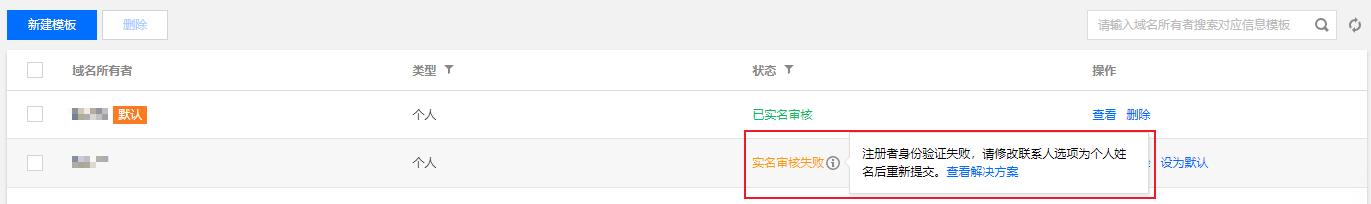 提交域名信息模板审核后,系统提示注册者身份验证失败,请修改联系人选项为个人姓名后重新提交时,您可以按照以下可能原因检查您填写的信息是否正确,完成修正后再重新提交信息模板审核。如下图所示:n